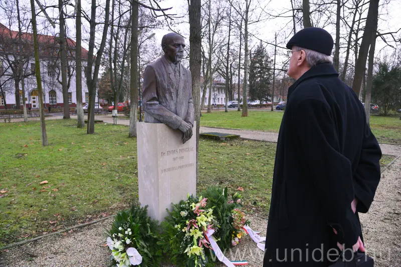 Endes Pongrác 110 éve, 1907 decemberében született, 1954-től több mint két évtizeden keresztül vezette az egyetem Kórbonctani Intézetét. A patológus professzor tiszteletére 10 éve szobrot állítottak a Klinikai Központ területén. Az alkotást szerdán, Endes Pongrác születésének 110. évfordulója alkalmából családtagjai és tisztelői koszorúzták meg.